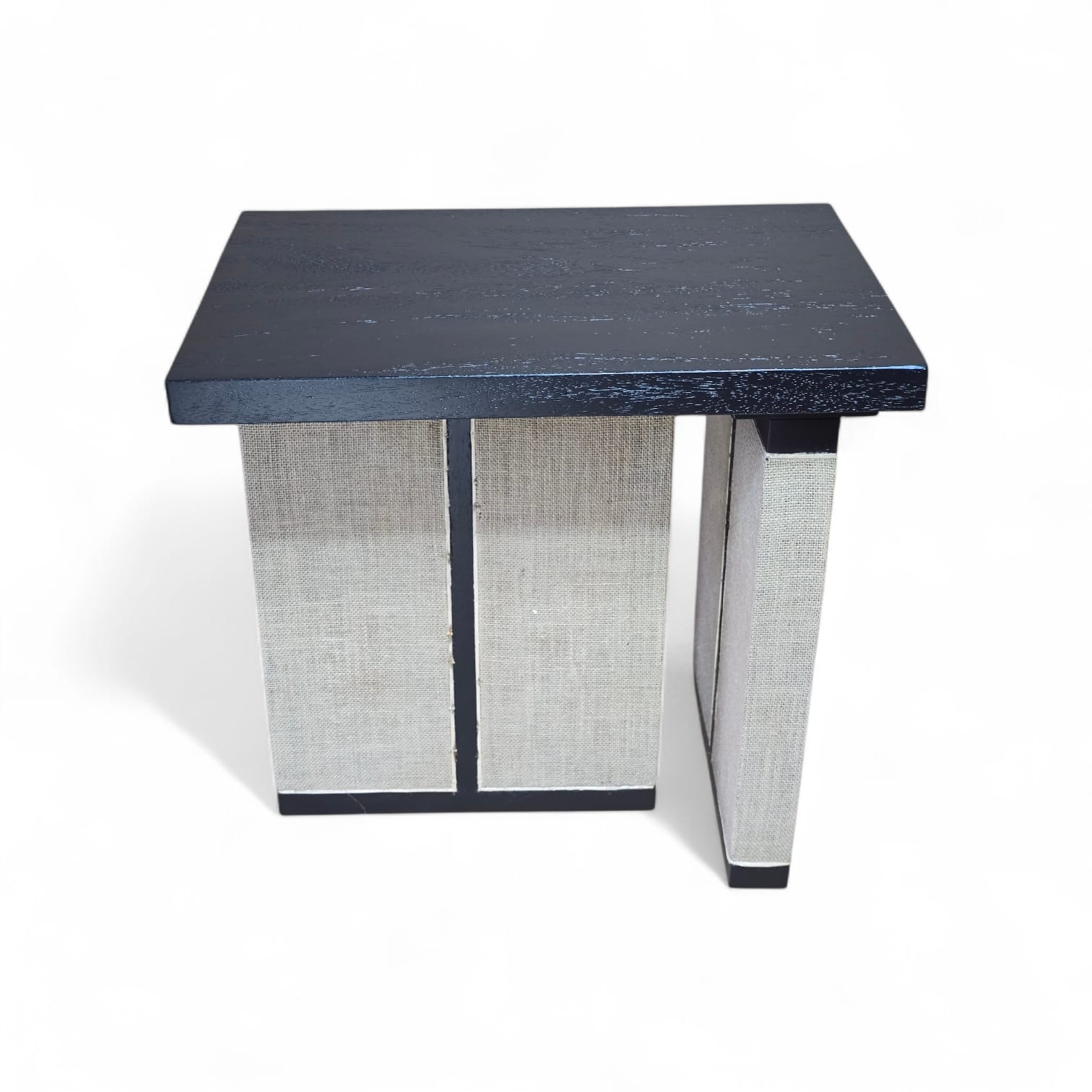This handcrafted side table by Sentana Art Wood combines a solid wood top with textured panel detailing for a refined contemporary look. The clean geometric form contrasts beautifully with the natural fabric-like surface, creating a balanced blend of structure and warmth.