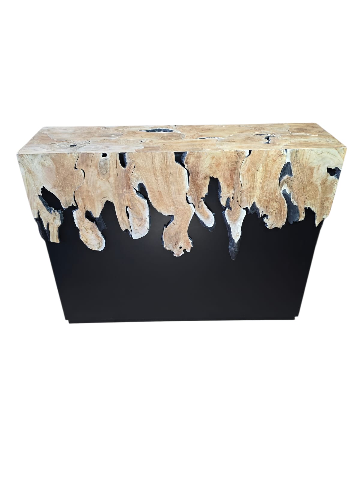 A handcrafted solid wood bar table featuring a dramatic live edge design and deep resin base. The natural wood grain flows organically over a bold geometric form, creating a striking waterfall effect.