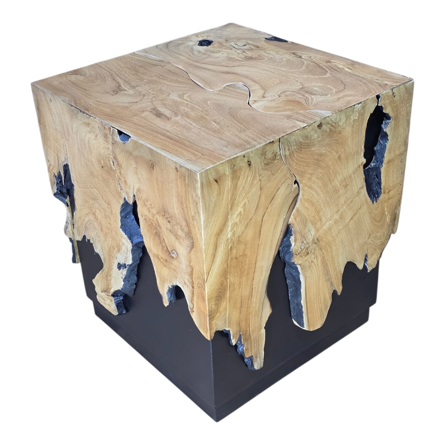 A handcrafted solid wood side table featuring natural live edges and resin detailing. The organic wood grain flows seamlessly over a bold matte base, creating a sculptural waterfall effect from every angle.